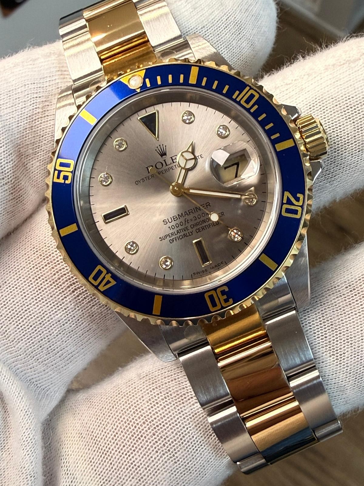 Rolex Submariner Date 16613 – Serti-wijzerplaat – 2005 – 100% NOS – Nooit gedragenHierbij aangeboden: een uitzonderlijk zeldzame en originele New Old Stock (NOS) Rolex Submariner Date referentie 16613, vervaardigd in 2005, met de zeer gewilde Serti fabriekswijzerplaat met originele diamanten en saffieren uurmarkeringen.